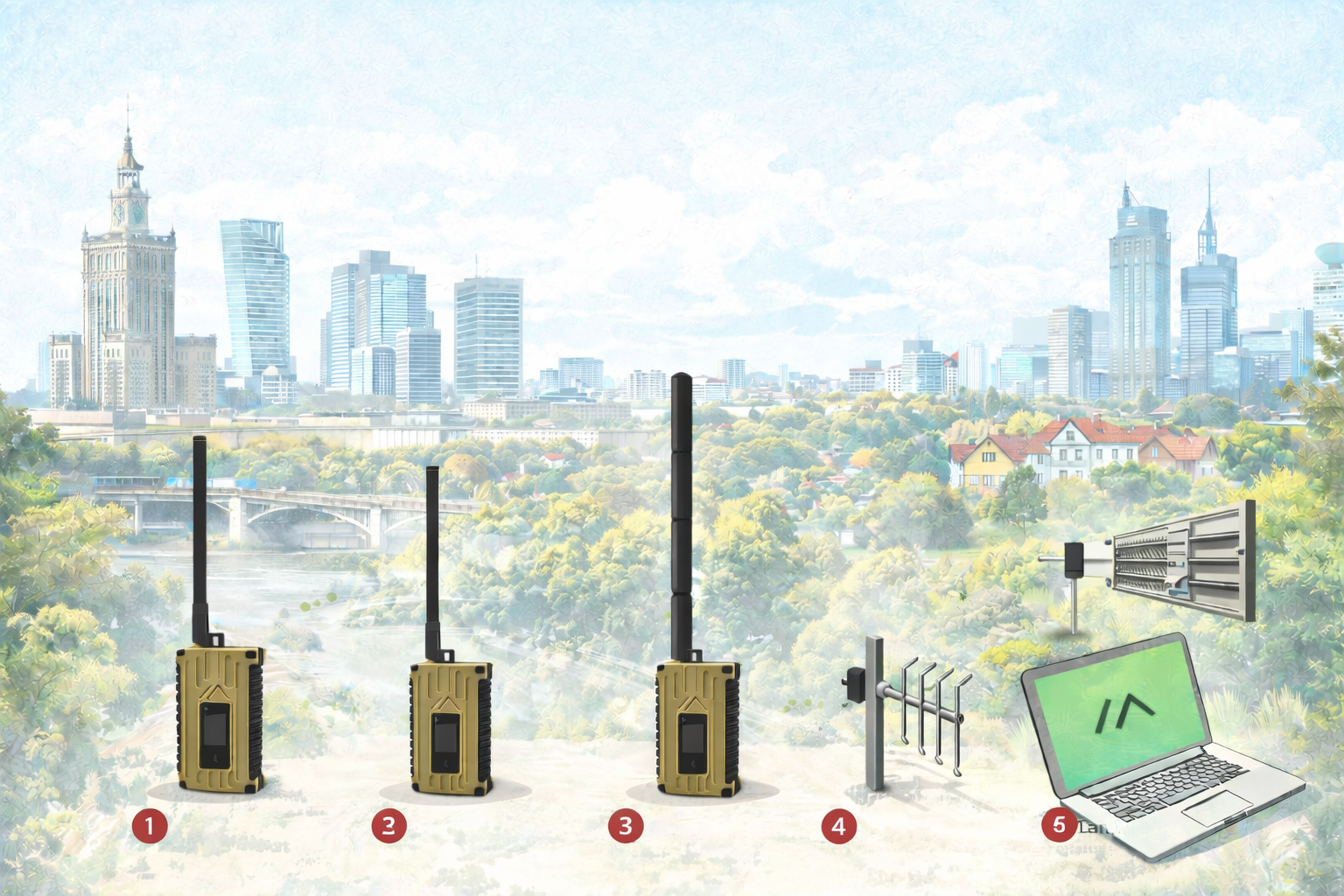 - jedna 8 dBi antena na najwyższym budynku